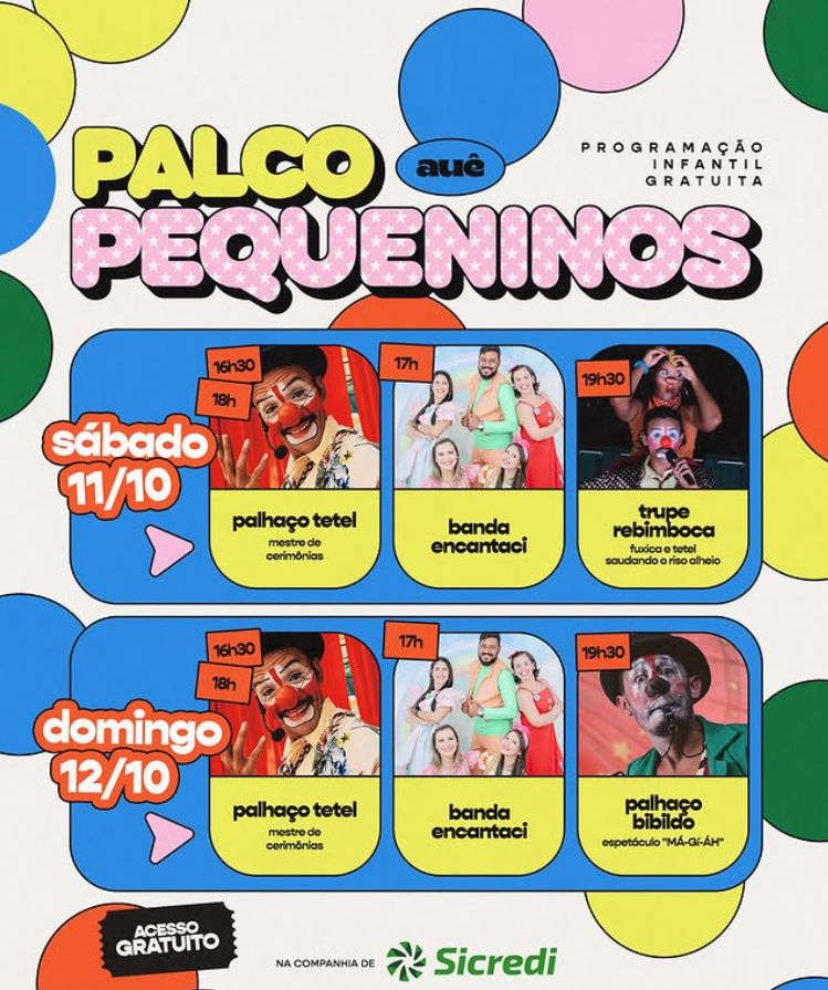 O Dia das Crianças vai ser pura alegria no Palco Pequeninos! A festa começa às 16h30 com o Palhaço Teteu, o mestre das trapalhadas e das boas risadas, seguido às 17h pela Banda Encantassi, que chega trazendo muita música, dança e diversão pra toda a família. E pra encerrar com chave de ouro, às 19h30, a Trupe Rebiboca, Fuxica e Teteu apresenta “Saudando o Riso Alheio”, um encontro cheio de humor, brincadeiras e encantamento. Prepare-se pra um sábado de gargalhadas, música e muita energia boa do jeitinho que os pequenos adoram!