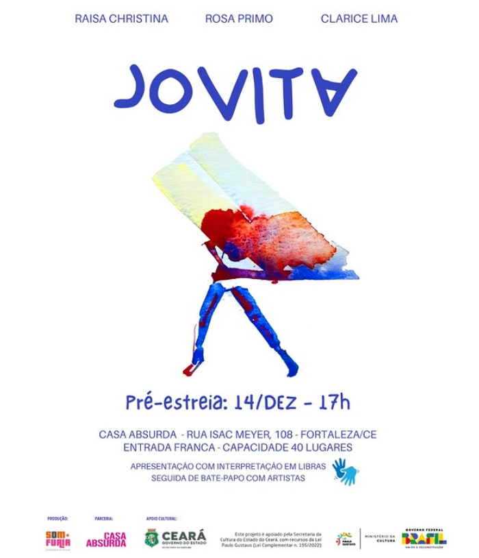 “Jovita – quem é essa mulher?” é um espetáculo de dança para as infâncias que parte da figura histórica de Jovita Feitosa para criar uma experiência lúdica e sensível sobre coragem, liberdade e invenção. Inspirada na jovem cearense que desafiou seu tempo ao tentar ir à guerra, a obra transforma a ideia de combate em brincadeira, onde marchas viram jogos e uniformes se tornam fantasias. Em cena, o corpo que dança brinca, cria e se reinventa, convidando crianças e adultos a experimentarem outros modos de ser e existir, celebrando a potência da imaginação e da infância como força transformadora.