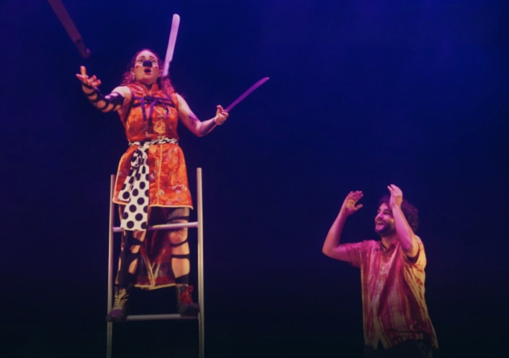 “Coragem, a Palhaça Covarde” é um número circense que combina humor, tensão e habilidade em uma cena cheia de surpresas. Interpretada por Estefanía Vélez Rojas, a palhaça enfrenta seus próprios medos enquanto se arrisca em números de equilíbrio e malabarismo, criando uma situação cômica em que coragem e insegurança caminham lado a lado, convidando o público a rir e torcer a cada tentativa.