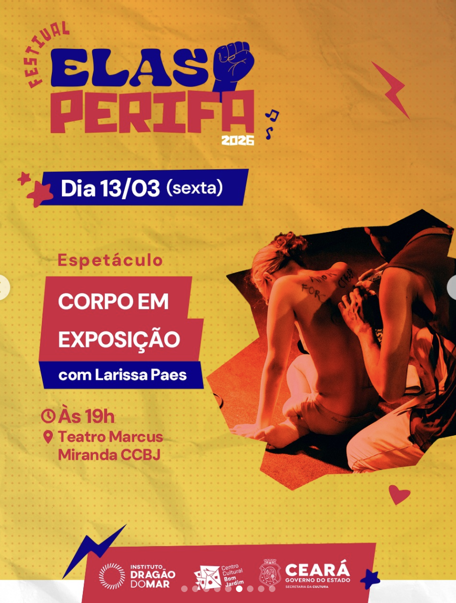 “Corpo em Exposição”, com Larissa Paes, é um espetáculo apresentado dentro da programação do Festival Elas Perifa 2026. A montagem propõe uma investigação cênica sobre o corpo em cena, explorando presença, gesto e expressão por meio de uma linguagem performativa que convida o público a refletir sobre o corpo como território de criação artística.