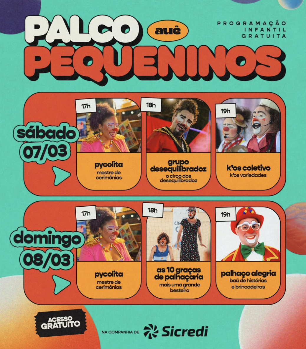 O Palco Auê Pequeninos apresenta uma programação infantil gratuita dedicada à linguagem do circo e da palhaçaria. Entre as atrações estão Pycolita como mestre de cerimônias, o Grupo Desequilibradoz com o espetáculo “O Circo dos Desequilibradoz”, o K’os Coletivo com “K’os Variedades”, o espetáculo “As 10 Graças de Palhaçaria” com “+1 Grande Besteira” e o Palhaço Alegria com “Baú de Histórias e Brincadeiras”, reunindo números circenses, humor e interação para divertir crianças e famílias.