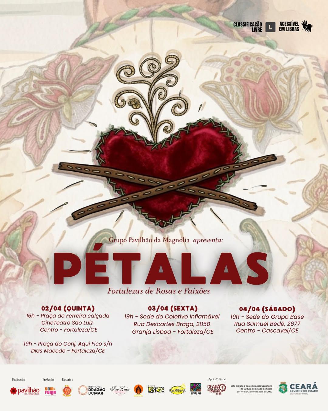 Inspirado na cultura popular nordestina, o espetáculo “Pétalas – Fortalezas de Rosas e Paixões” transforma o espaço público em palco de encontro e partilha, atravessando temas contemporâneos para recontar, com sensibilidade e potência estética, a Paixão de Cristo. A montagem do Grupo Pavilhão da Magnólia propõe uma experiência coletiva que mistura tradição, emoção e reflexão, convidando o público a revisitar uma das histórias mais conhecidas da humanidade sob novos olhares.