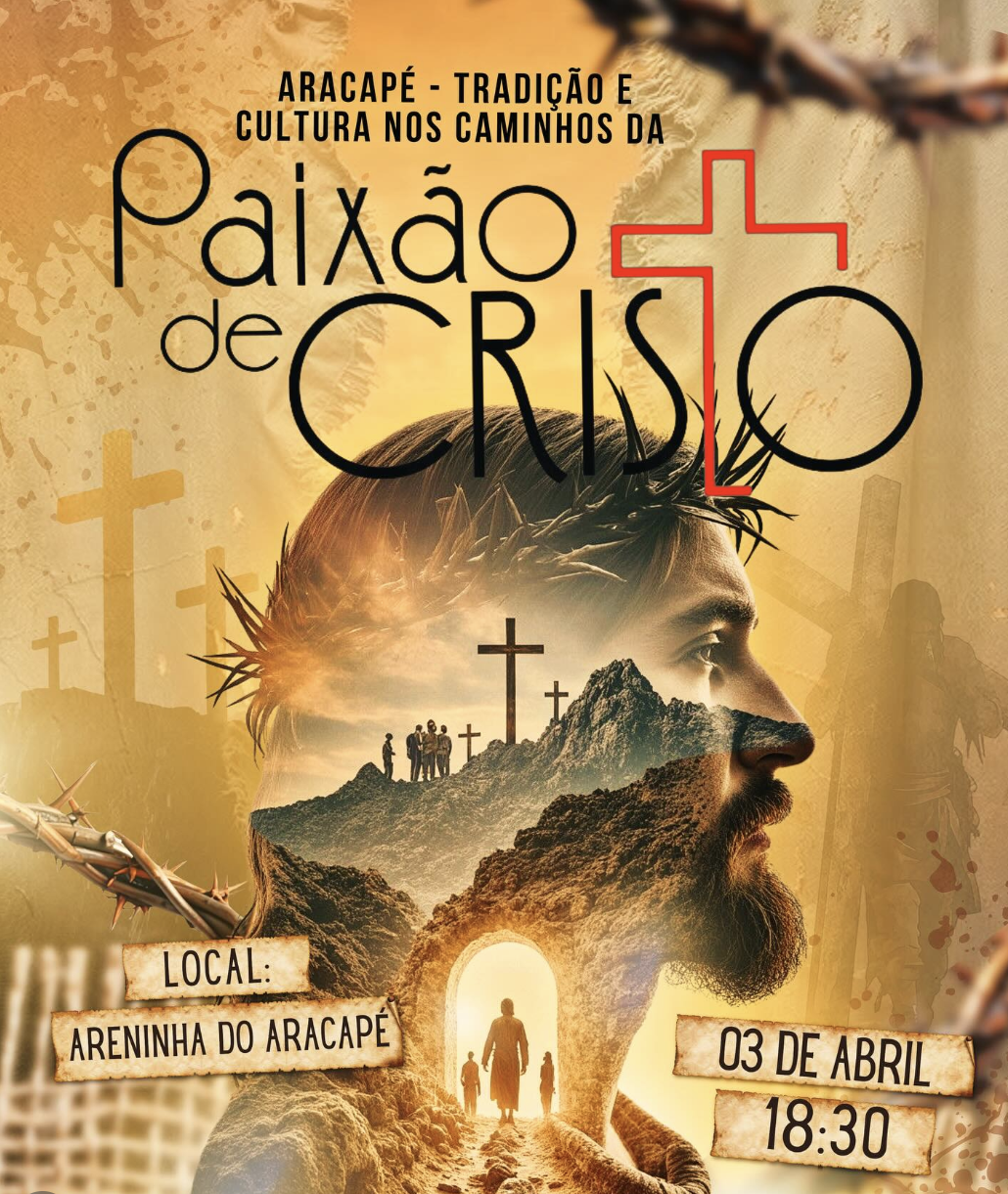 “Aracapé – Tradição e Cultura: Nos Caminhos da Paixão de Cristo” propõe uma encenação que entrelaça fé, memória e identidade comunitária ao revisitar os últimos momentos de Jesus. Com forte presença de elementos da cultura local, o espetáculo transforma a praça em um espaço simbólico de devoção e encontro, onde a narrativa da Paixão é conduzida com intensidade emocional e participação coletiva, reafirmando a tradição popular como expressão viva da comunidade.