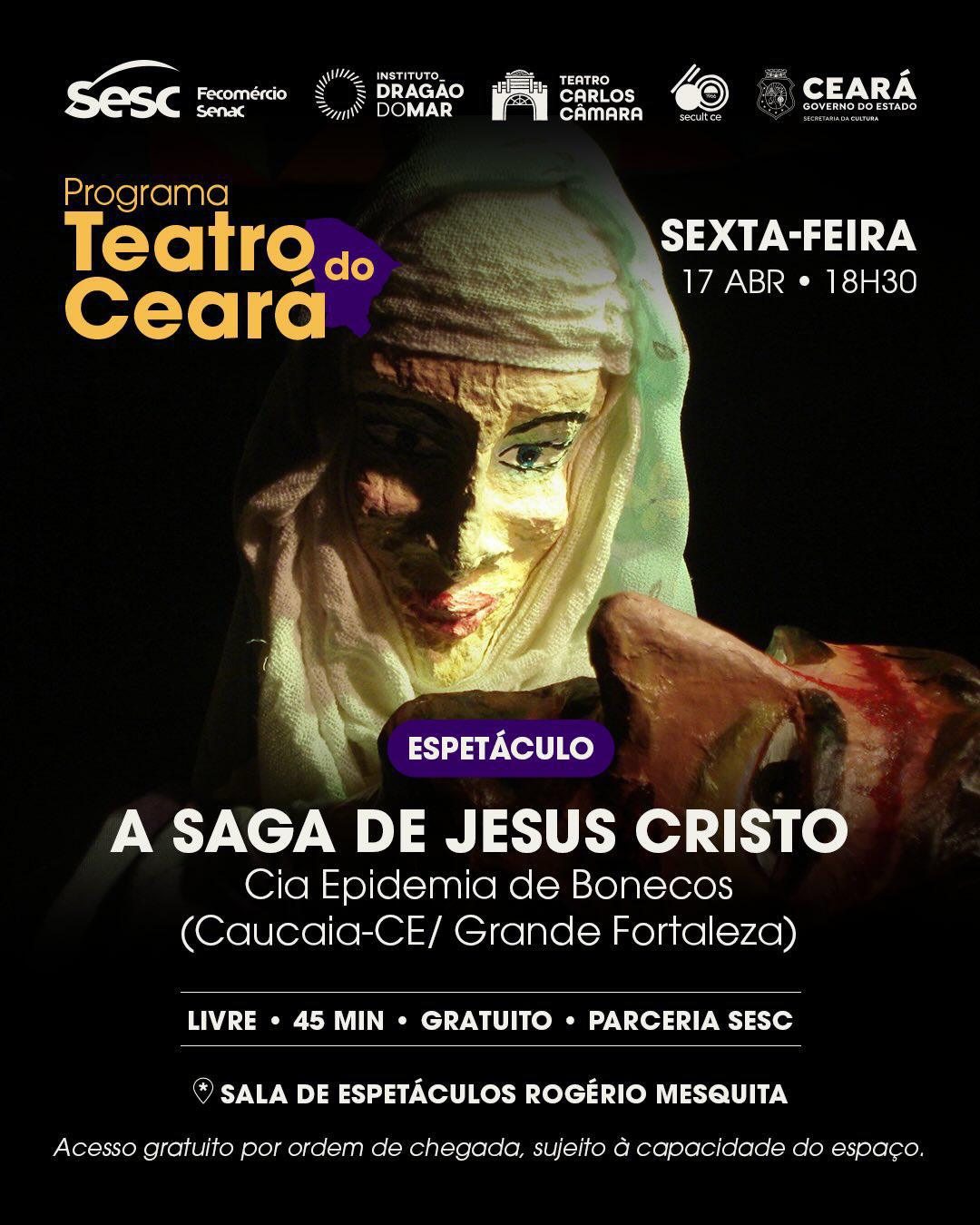 Com uma linguagem visual potente e simbólica, a Cia Epidemia de Bonecos revisita a trajetória de Jesus Cristo por meio do teatro de formas animadas, explorando imagens que tensionam fé, dor e humanidade. A encenação se constrói a partir de uma estética expressiva, em que bonecos e elementos cênicos ganham vida para narrar episódios marcantes dessa história, convidando o público a uma experiência sensorial e reflexiva. Entre o sagrado e o humano, o espetáculo propõe um olhar sensível e contemporâneo sobre um dos relatos mais conhecidos da cultura ocidental.