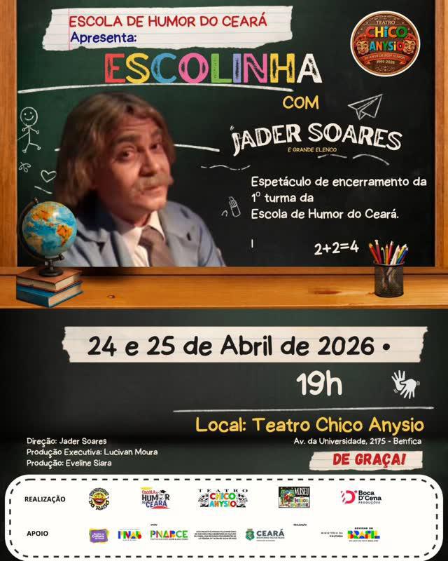 Inspirado no clássico universo da Escolinha do Professor Raimundo, o espetáculo “Escolinha com Jader Soares” celebra o encerramento da primeira turma da Escola de Humor do Ceará com uma montagem inédita que mistura reverência e renovação. Em cena, os alunos dão vida a personagens icônicos eternizados por Chico Anysio, enquanto apresentam novas piadas e situações criadas especialmente para o espetáculo. Com direção e dramaturgia de Jader Soares, a montagem aposta no frescor da nova geração do humor cearense, mantendo viva a tradição da comédia popular com emoção, crítica e muitas gargalhadas.