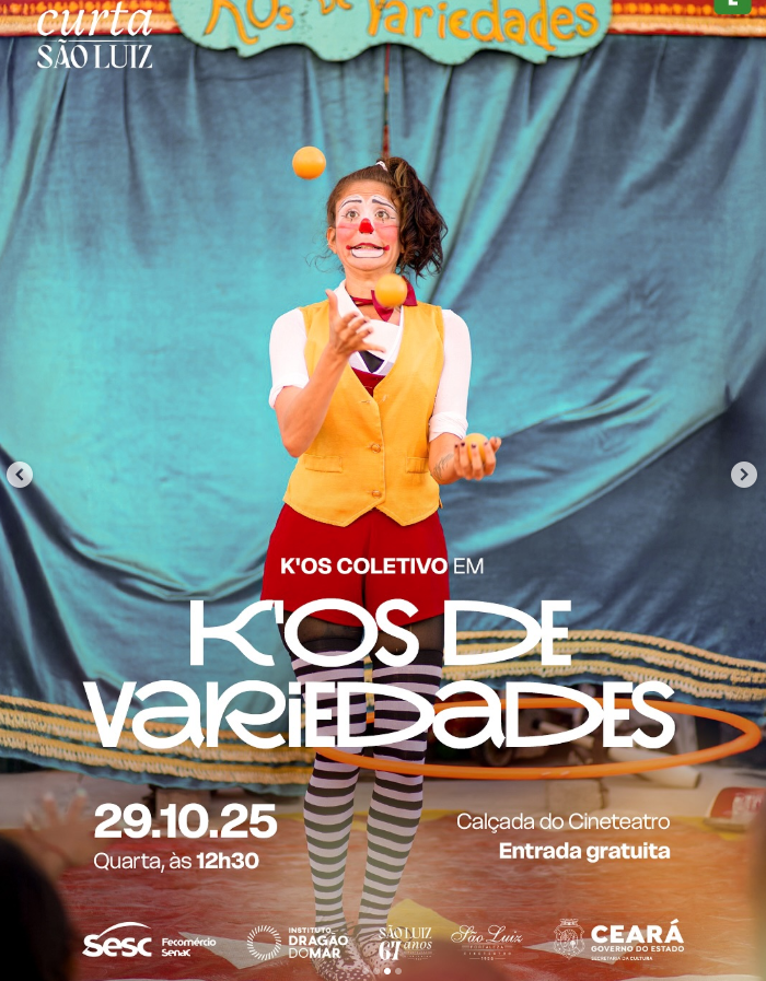 Inspirado no Teatro de Feira, o espetáculo “K’Os de Variedades”, do K’Os Coletivo, apresenta uma sequência divertida de números de palhaçaria, música e magia cômica que encantam crianças e adultos, celebrando o riso e a alegria em família.